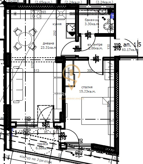 Имотът се състои от входно антре, дневна, спалня, баня с тоалет, тераса.