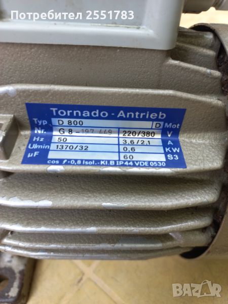 Мотора е 3фазен с мощност 600вт диаметьр на изходния вал 30мм/