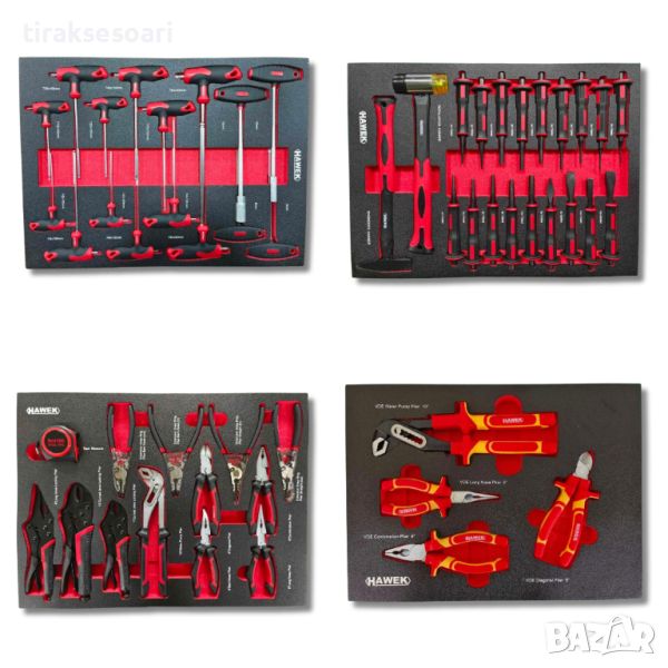 Количката за работилница Hawek е оборудвана с допълнителен набор от най-висококачествени инструменти, които ще отговорят на нуждите дори на най-взискателния потребител. Богатото оборудване на шкафа Hawek ще ви позволи да персонализирате набора от инструменти, за да отговорите на нуждите на най-взискателните предизвикателства в работилницата