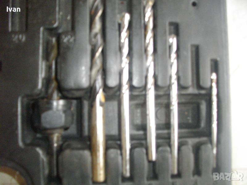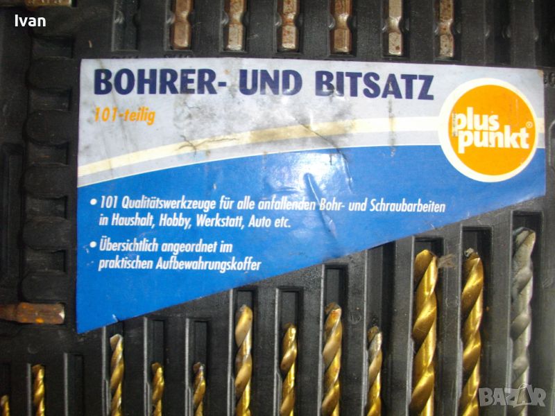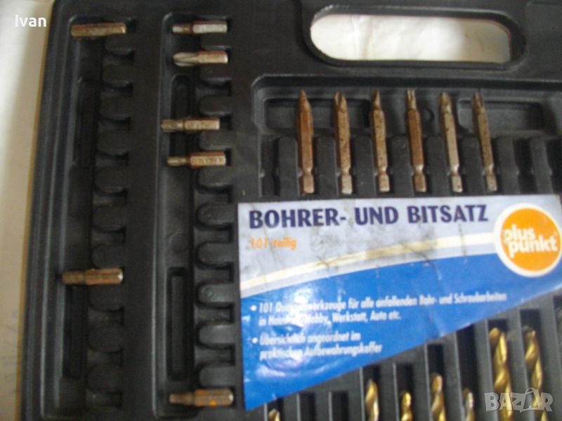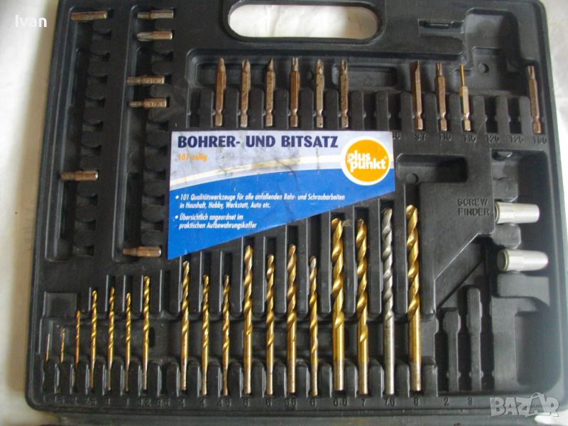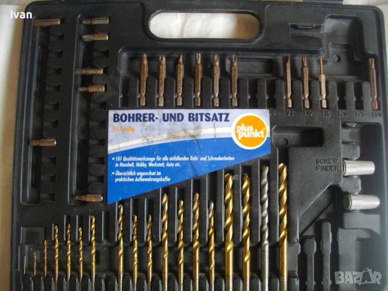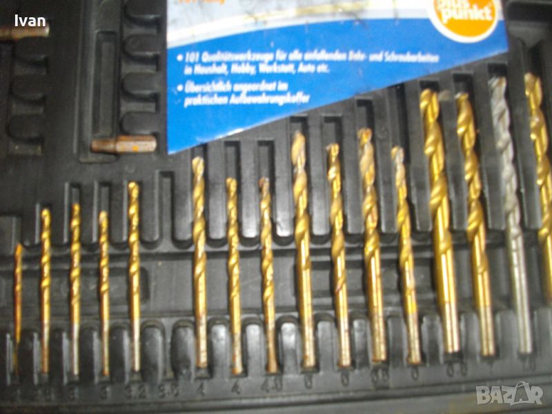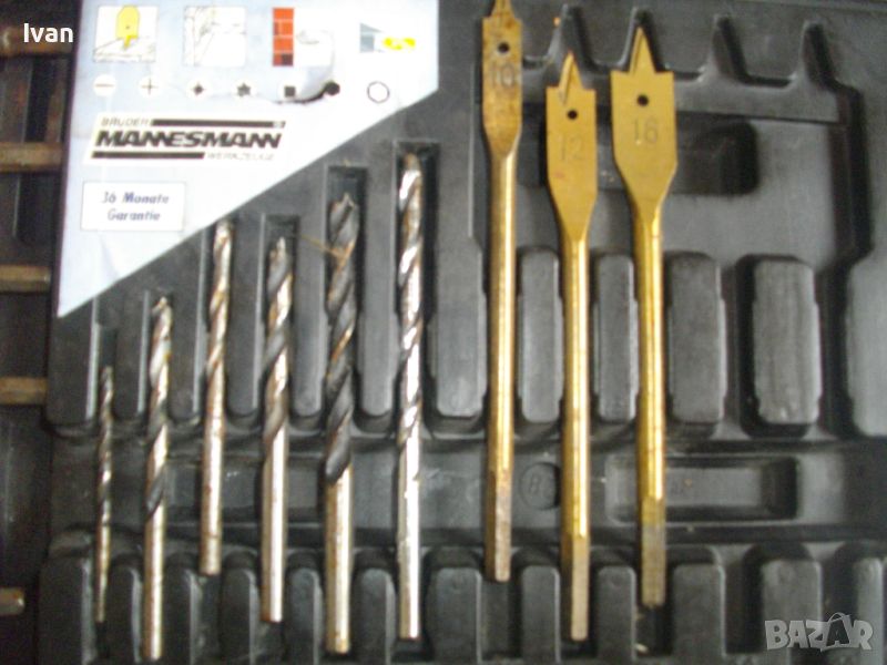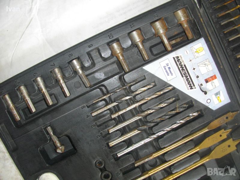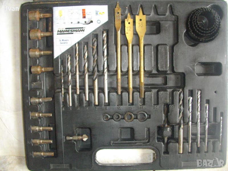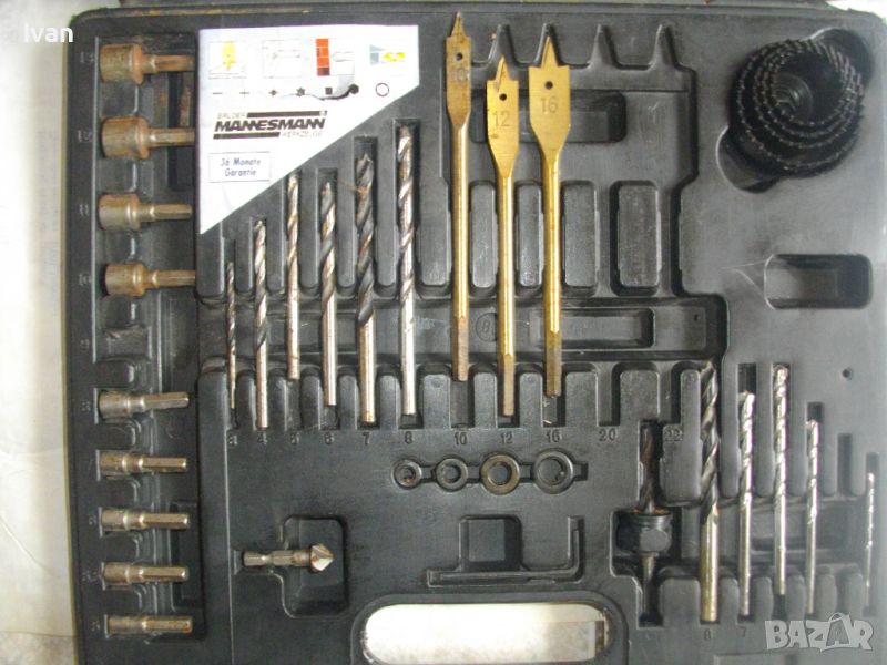 ОПИСАНИЕ на инструменти гедория в черен пластмасов куфар - цена 139 лв. Нов комплект, немски оригинален на Манесмън. Марка и модел - Bruder Mannesmann Werkzeuge 101 tlg. BOHLER und Bitsalz - Germany. Комплектът е непълен /общо трябва да са 101 части. Налиични са 73 части компоненти и инструменти. Размери на куфара - 345 х 295 х 50 мм. Включва битове, накрайници, адаптери, свредла големи и малки, 4 бр. масивни твърди борфрези/боркорони за дърво/метал с адаптери, 3 бр. дърводелски свредла размери 10мм - 12 мм - 16 мм, 5 бр. държачи ии водачи за боркороните, цилиндрична фреза, 9 бр. адаптерни торса вложки различни размери. Куфара е с вложка вградена за местата на компонентите.