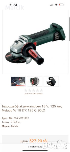 акумулаторен ъглошлайф на метабо работещ с 18волта литиеви батерии долната част където се слага батерията се върти за по удобна работа пазарната цена в магазина е 527лв