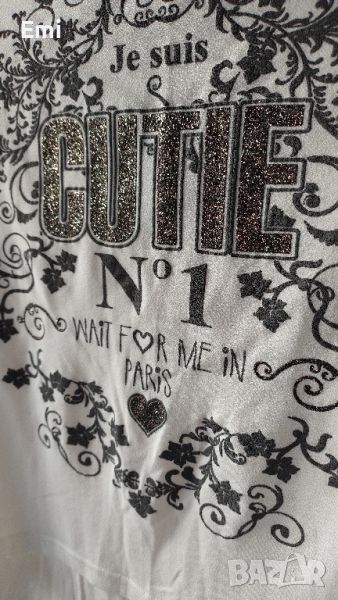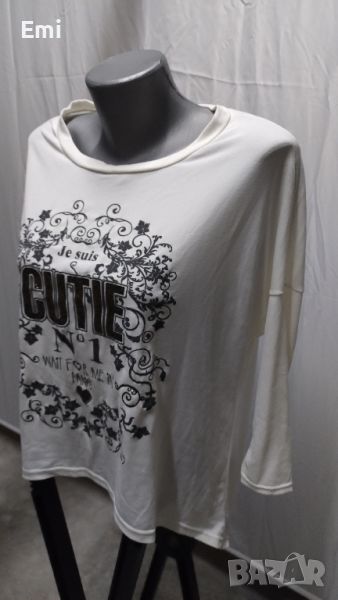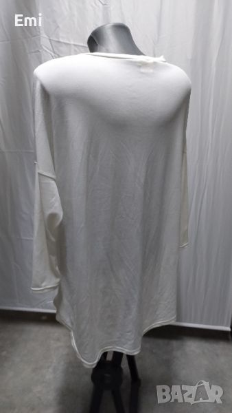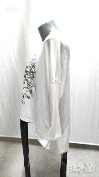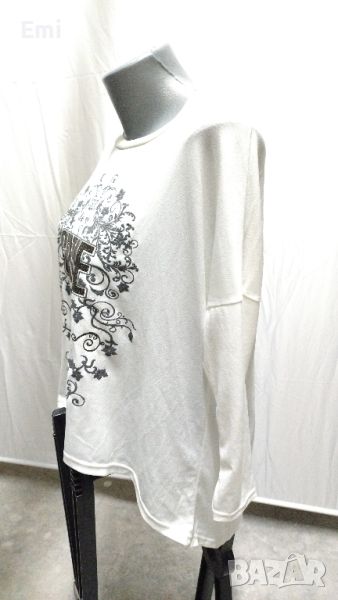 Продавам ефектна дамска туника в бяло, с красиви апликации на цветя и бляскави букви. Ръкавите са 3/4, отпред е със стандартна дължина, а отзад е удължена, за да покрива дупето. Моделът е перфектен за съчетание както с дънки в ежедневието, така и за малко по-елегантна визия.