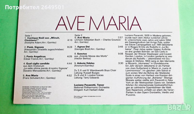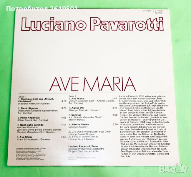 Лучано Павароти-Аве Мария-Немска Грамофонна плоча, Качество Минт! → Обява 46704229