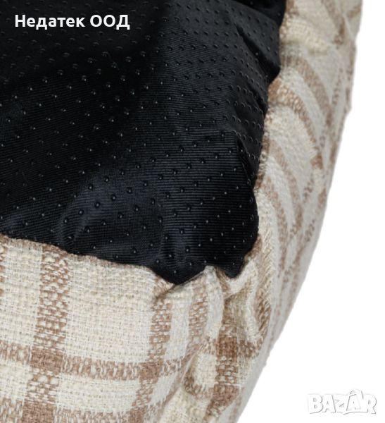 Правоъгълно кучешко легло с кафява мека повърхност имитация на козина отвътре и бежово каре отвън с кафяво райе. Има неплъзгащо се дъно. Подходящ за използване на закрито.