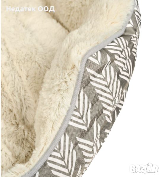 Правоъгълно легло с бежова пухкава козина отвътре и сиво отвън, изработено от водоустойчив материал с бели шарки. Има неплъзгащо се дъно. Подходящ за използване на закрито.