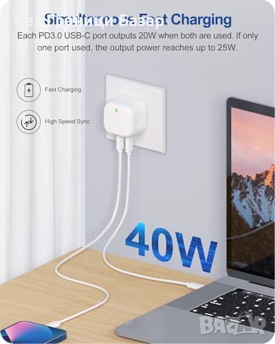 Двоен 20W USB C адаптер: Зареждайте две устройства едновременно с до 20W всяко.