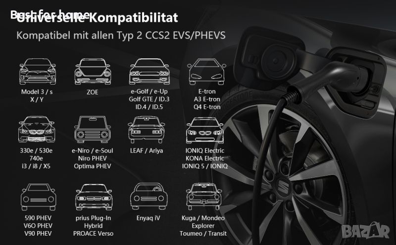 Кабелът за зареждане тип 2 е съвместим с повечето електрически превозни средства и plug-in хибридни превозни средства, включително S/3/X/Y, i3, i4, iX3, ID.3, ID.4, ID.5, E-Tron, EV6 , EQC, ZOE, I-Pace, Kona electric, Leaf (40 kWh), E-208, IONIQ 5, E-Niro, Enyaq. iV и телевизор. Aycan и други модели. Несъвместим с Тип 1, CCS1, CHAdeMO и GB/T гнезда за зареждане.