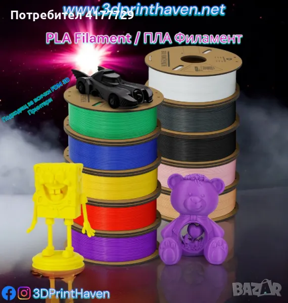 Налични типове филаменти като: PLA(Tricolor,Rainbow,Silk,Transperant,Galaxy,Flexible,CF и други), PETG, ABS, ASA, Carbon Fibre.