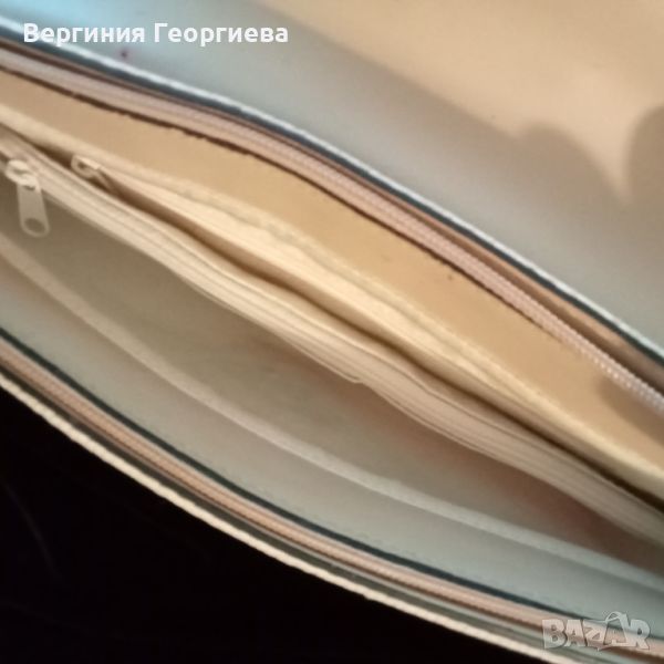 От изкуствена кожа, наподобява зебло. Има голям вътрешен джоб с цип, който дели чантата на две прегради, и друг малък джоб с цип. Размери - 30/15/8 см. Дължина на дръжката - 80 см. В отлично състояние, има две малки петънца на вътрешната страна /на последната снимка/. Купена е в Белгия.