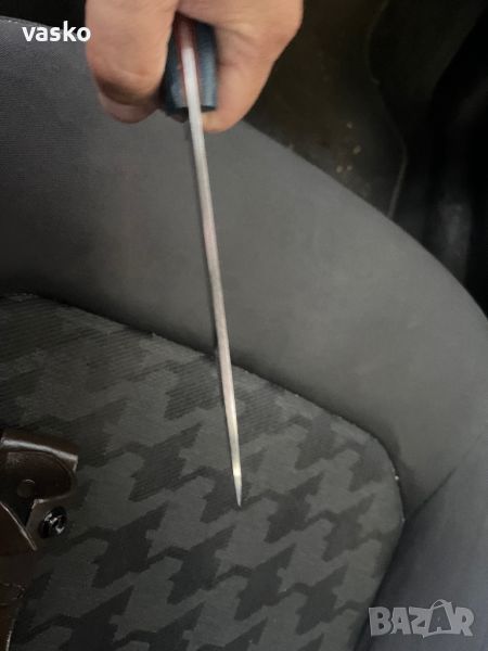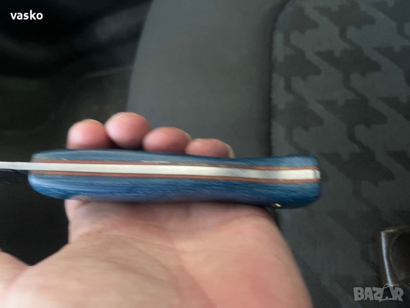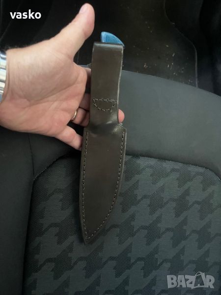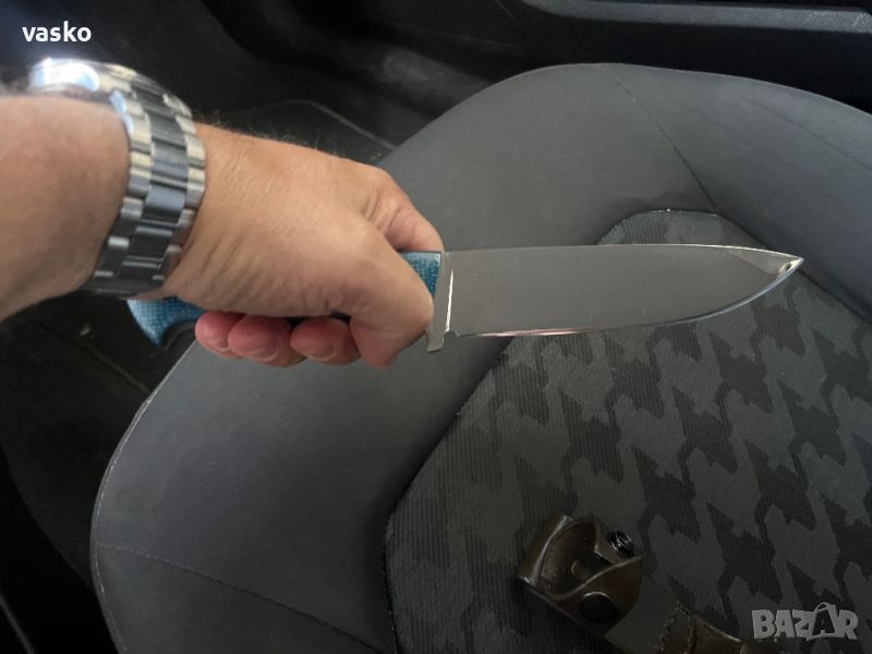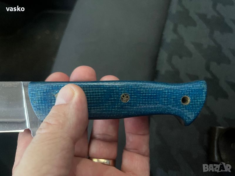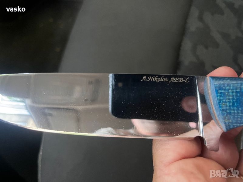 Нож ръчна изработка от стомана AEB-L закален на 60 еденици в пещ с криоцикъл,дръжка синя микарта с подложки ,фултанг ,обща дължина 27см,дължина на острие 14см,дебелина на острието 3мм,кожена катия,всичко е ново перфектно и ръчна изработка,маркиран-изработен от А.Николов.Острието е с огледална полировка-всички отблясъци по ножа са от снимките,трудно се снима без да има сенки и отблясъци.