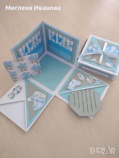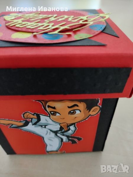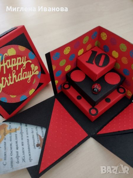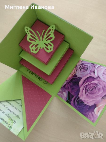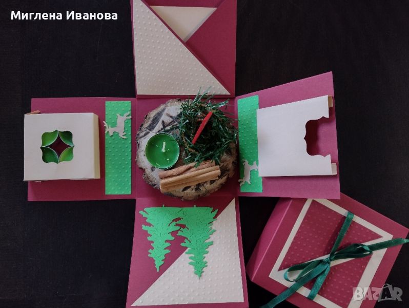 Експлодираща кутия ръчна изработка, която е изцяло изработен според желанието на клиента. Може да бъде покана за празник, може да бъде оригинален подарък за всеки повод. Изработват се в размери и цветове по избор. Могат да бъдат и само на заготовки. Цената е според размерите на кутийката и декорацията . На снимките повечето са 8/8 см. Втората и четвърта снимка са 10 € за ориентир.