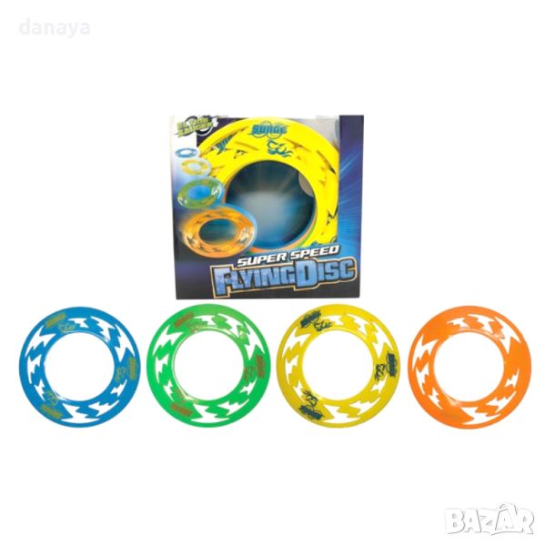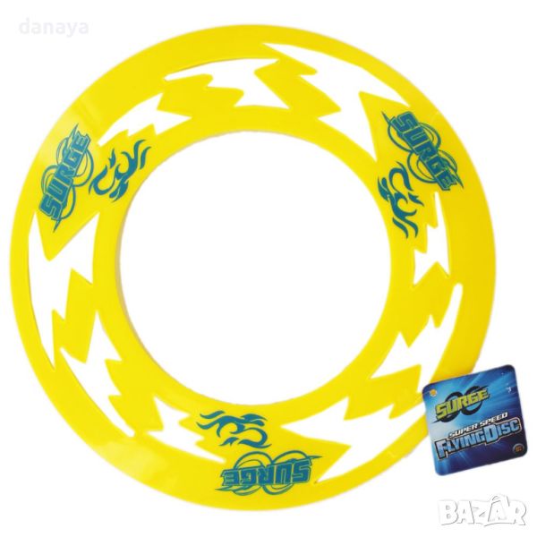 Фризби за игра навън. Летяща чиния, забавление на двора, на плажа, или на друго открито място. Изработено от пластмаса, предлага се в различни цветове.