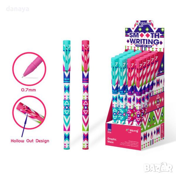 Химикалка, пишеща в синьо мастило с капачка. 2 атрактивни дизайна – LADYBUG калинки и GRAPHIC MAZE геометрични фигури. Пишат в синьо мастило, с дебелина на писеца 0.7mm. Гладко и лесно писане, създава комфорт в ръката.