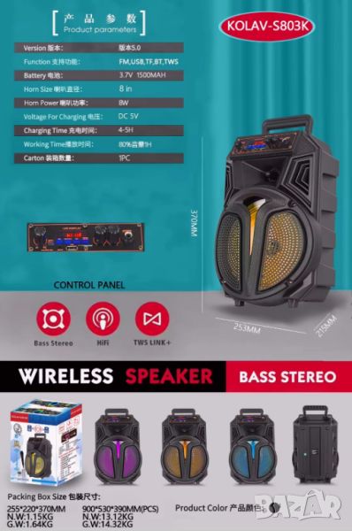 Bluetooth технология, FM радио, Презареждаема акумулаторна батерия 3.7V 1800mAh, Микрофон, USB, Дистанционно управление, 800W мощност, Размер на излъчвателя 20.32 см (8") и още...