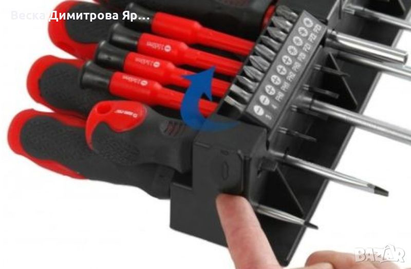 Брой части: 37; Материал: Хром-ванадиева стомана (CrV); Допълнителни характеристики: Магнитни върхове, ергономични дръжки, въртящи се глави на прецизните отвертки, специална тава за битове; Компактност и организация: Лесно сглобяване на закачалка с 4 отвора за монтаж; Тип отвертки: 8 x плоски и Phillips отвертки: 6x38 мм, 5x75 мм, 6x100 мм, 8x150 мм, PH2x38 мм, PH1x75 мм, PH2x100 мм, PH3x150 мм / 8 x прецизни отвертки: 2.0x50 мм, 2.5x50 мм, 3.0x50 мм, T9.50 мм, PH00x50 мм, PH0x50 мм, PH1x50 мм, T10x50 мм; Битове: 20 x 25 мм накрайници: 3-4-5-6-7 мм, PH0- PH1 -PH2 -PH3, T10, T15, T20, T25, T27, T30, T40, PZ-, PZ1- PZ2 -PZ3п; Битова отвертка: 1 бр.
