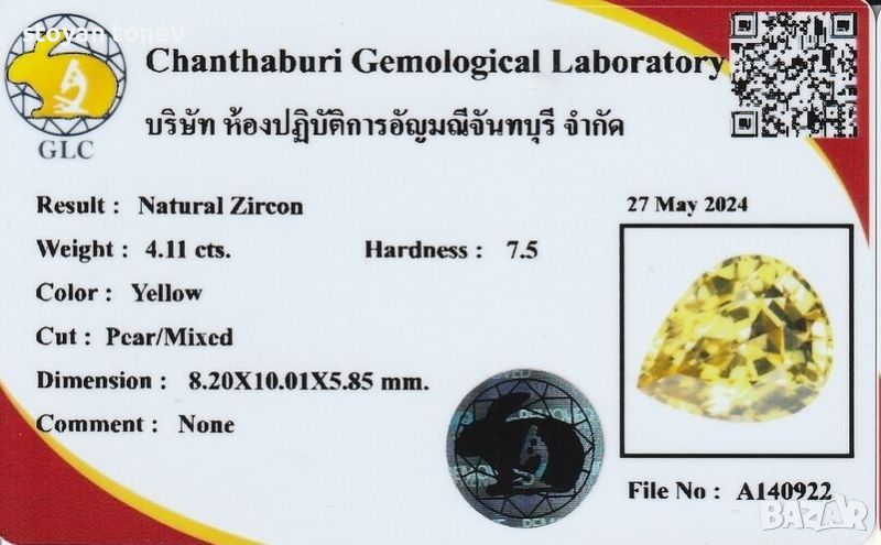 Голям натурален жълт циркон 4.11кт! Сертифициран! Нов!