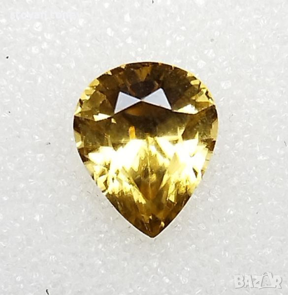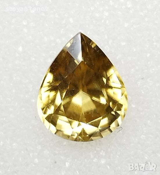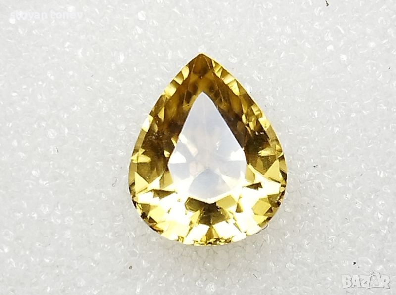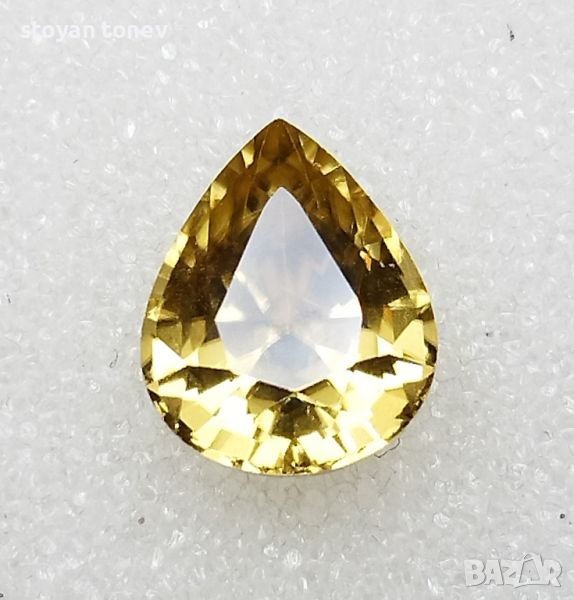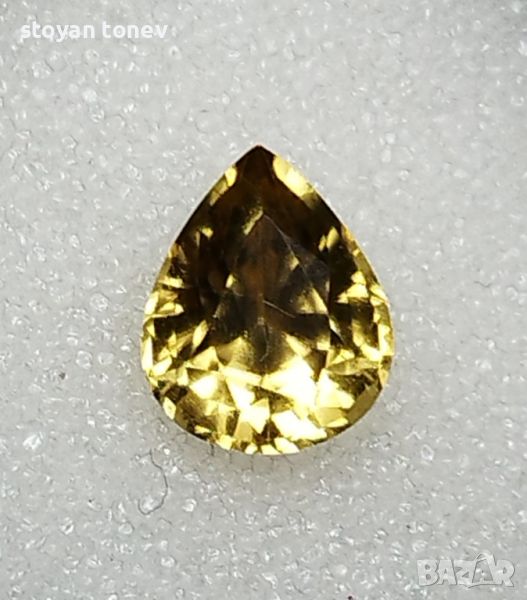 минимални включения видими с просто око. Цвета е жълт, наситен. Формата е круша с размери: 10.01 х 8.20 х 5.86мм.