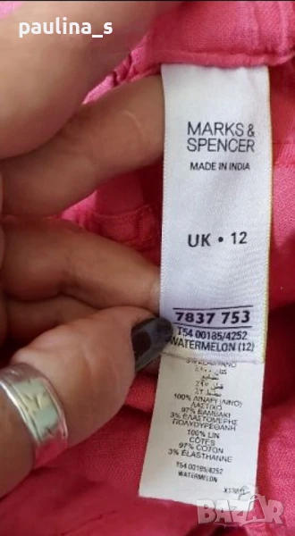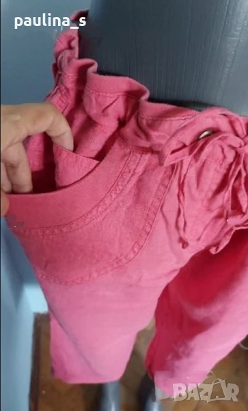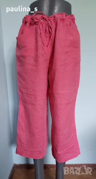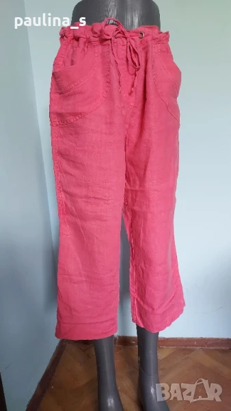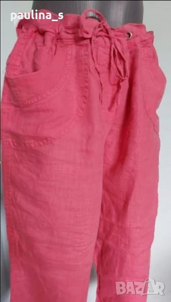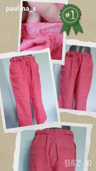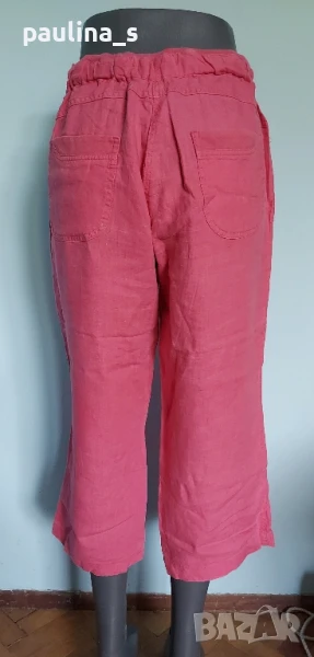 2️⃣. Колаж / L / XL - Ленени маркови бермуди "Marks & Spencer". Цената е крайна 29,99лв. Много готини маркови бермуди в неоново розово, с избелващ ефект, 100% лен за корпуса и еластично памучно трико за декорациите. Моделът се вижда добре, отзад талията се фиксира с ластик, отпред с шнурове. Една бройка, става за посочените размери, вижте мерките.