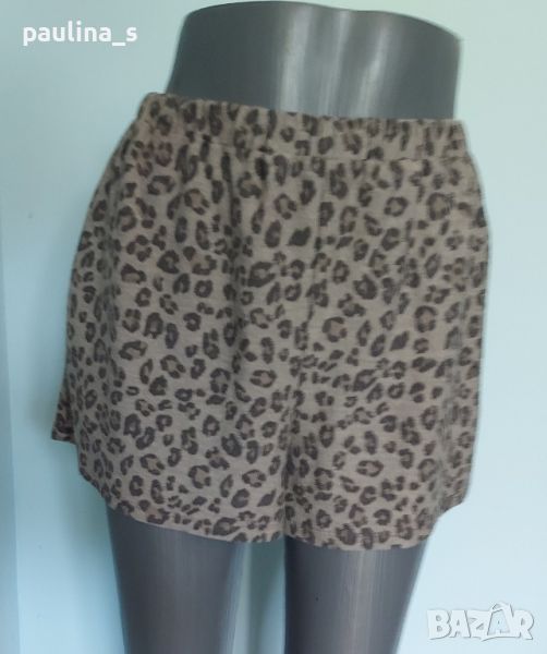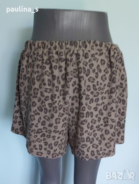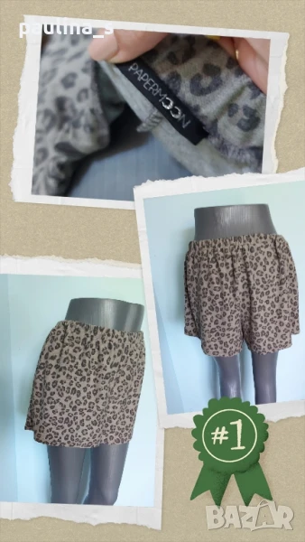 1️⃣. Колаж / L / 3XL "Papermoon". Цената е крайна 19,99лв. Къси панталони с джобове в сив леопардов принт от полиестер, немачкаема материята, лесно съхне. Талията е на ластик, материята е еластична и покрива няколко размера, посочени са. Голям размер, една бройка, нови са, без дефекти и етикет.