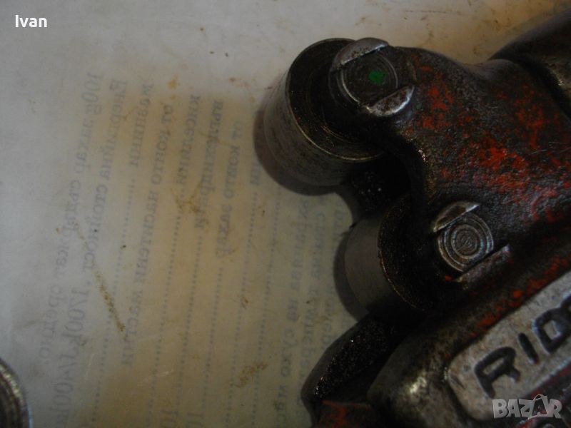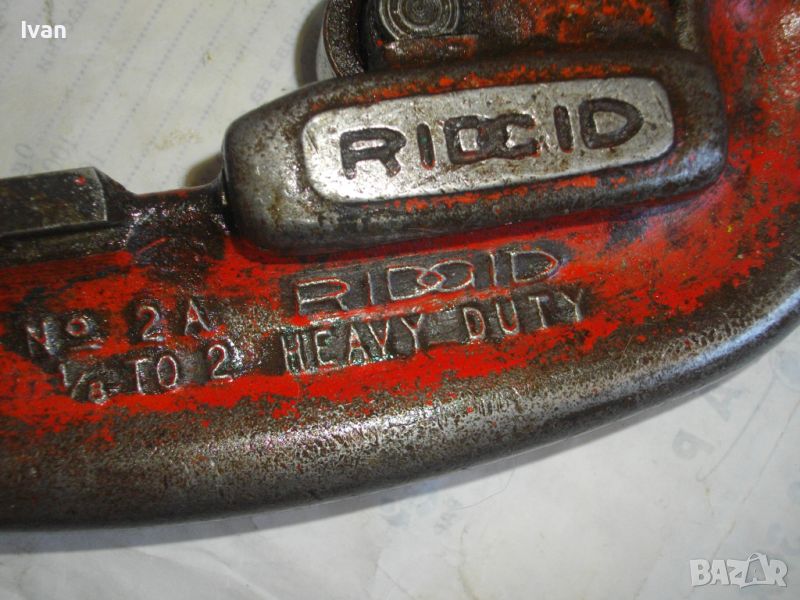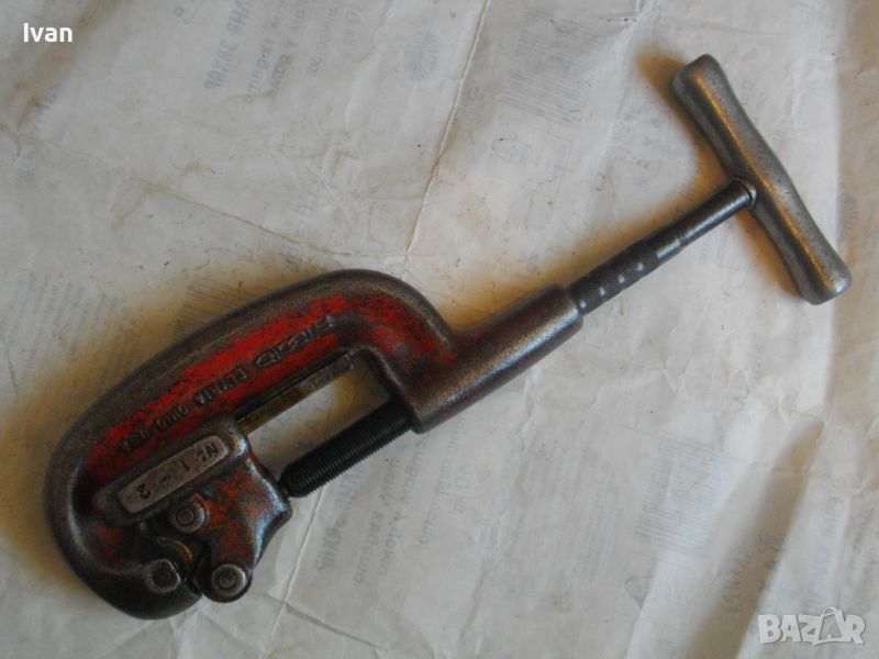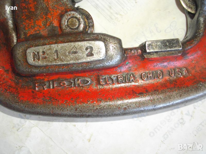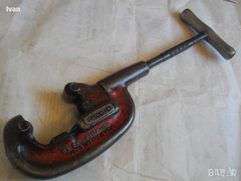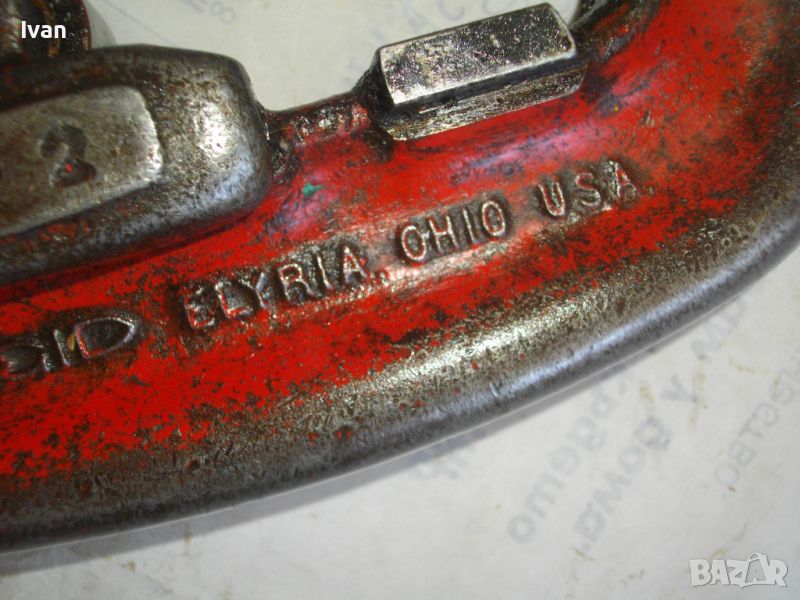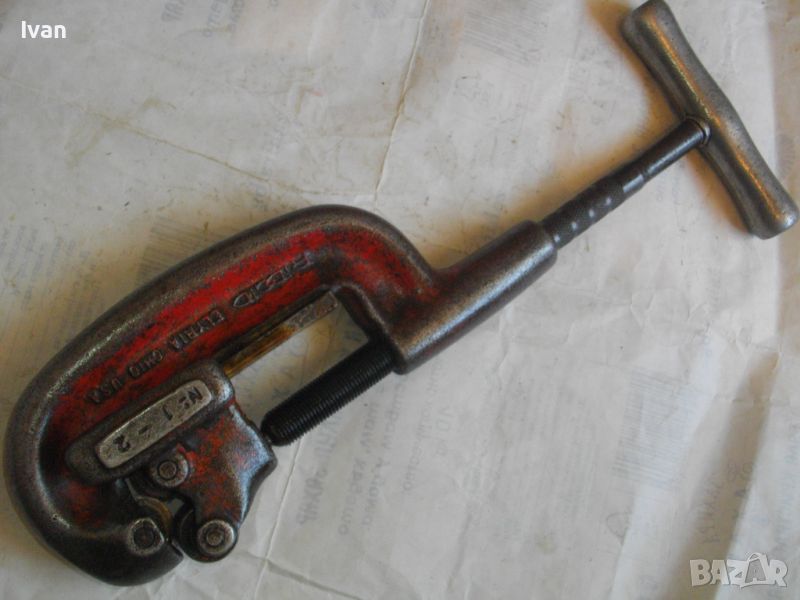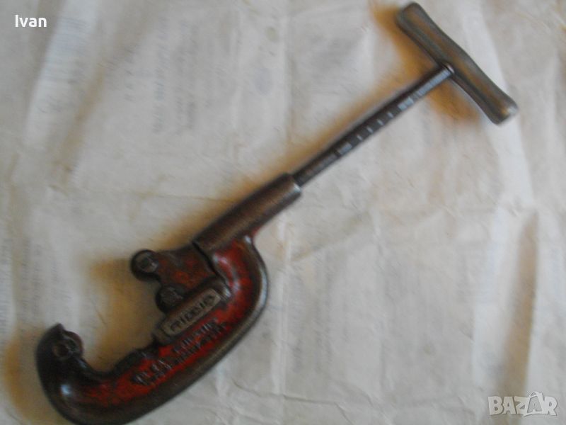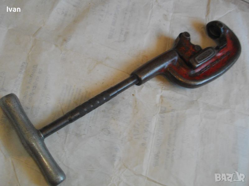 RIDGID ELYRIA OHIO - USA. Работено е с него, но е в пълна техническа/работна изправност. Голям резец 40 мм без наранявания и два въртящи се ролкови лагера за легло на тръбата, която се реже. Дължина 50 см, материал - дебело масивно желязо, върток дръжка - алуминий. Тегло на инструмента - 3,0 кг.