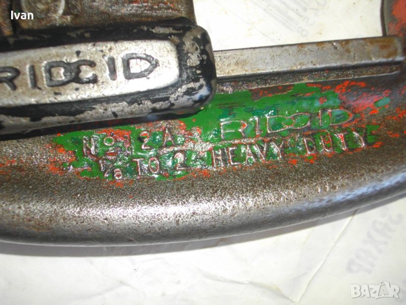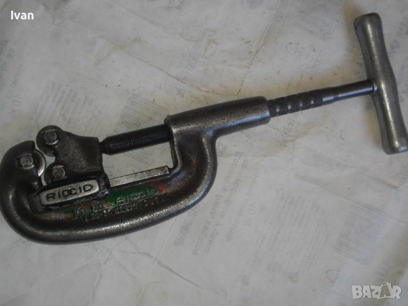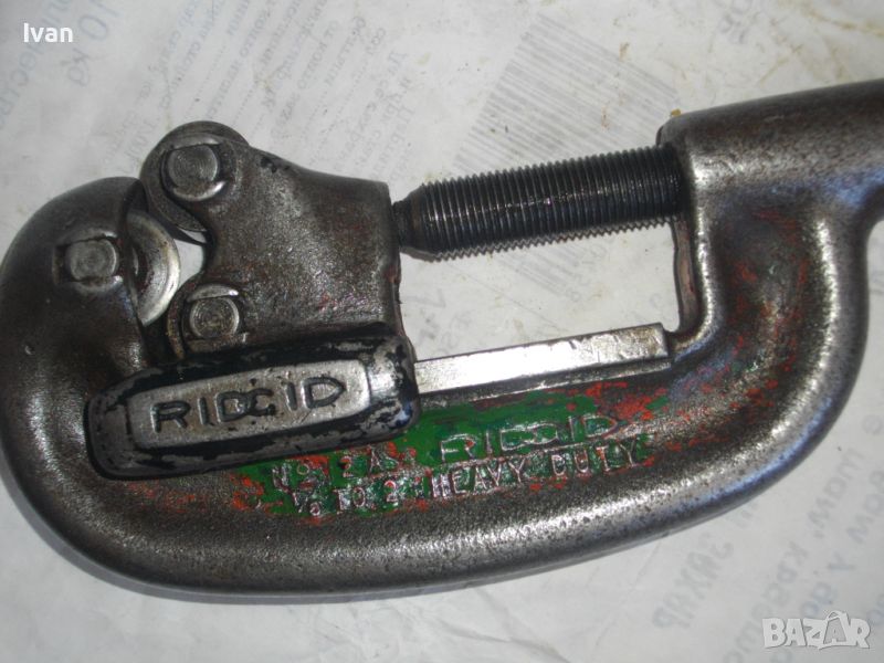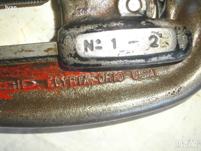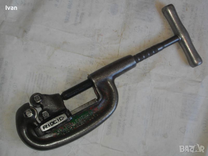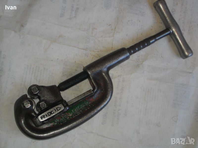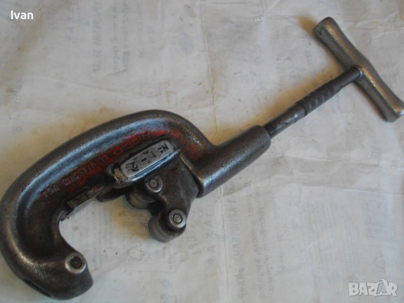 RIDGID ELYRIA OHIO - USA. Работено е с него, но е в пълна техническа/работна изправност. Голям резец 40 мм без наранявания и два въртящи се ролкови лагера за легло на тръбата, която се реже. Дължина 50 см, материал - дебело масивно желязо, върток дръжка - алуминий. Тегло на инструмента - 3,0 кг.