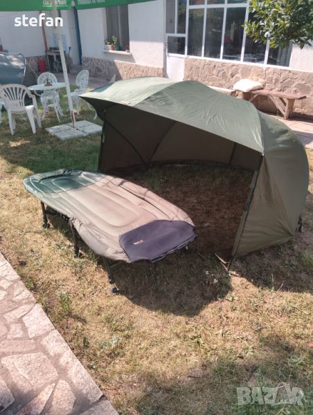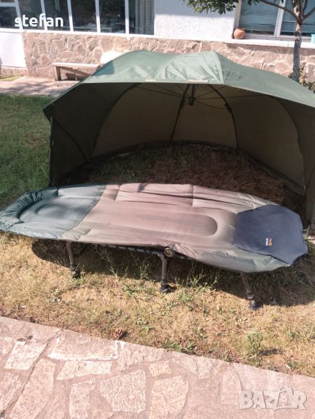 Продавам шаранджийски чадър заслон употребяван внос от Англия за 160лв. Запазен стол за 140лв. Легло за 200лв. Малко легло за 150лв.