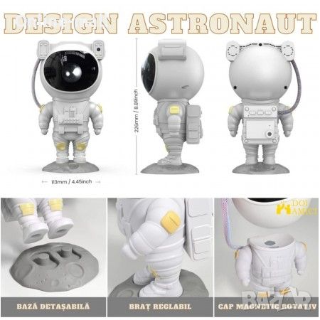 Този звезден проектор за нощна светлина е проектиран да изглежда като астронавт. Дизайнът на външния вид е новаторски и уникален, отразяващ темата за звездното небе и галактиката, а главата на астронавта е магнитно свързана с тялото, което може да бъде завъртяна на 360° позволява мъглявината да бъде проектирана навсякъде без ограничения.