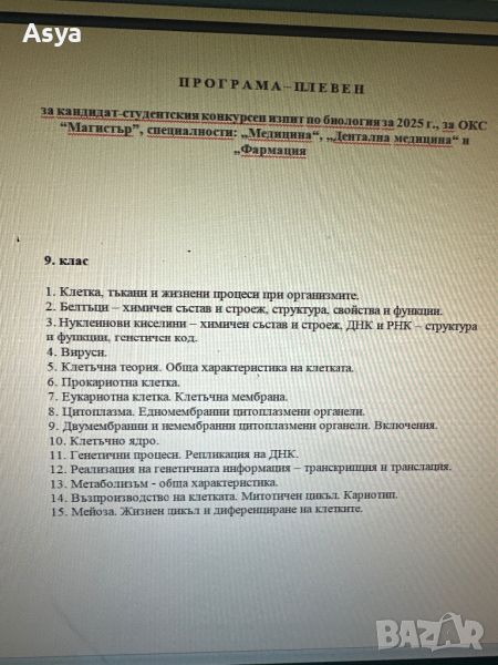 Теми по биология за кандидатстване медицина в МУ Плевен → Обява 46728681