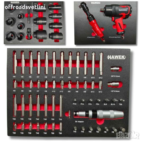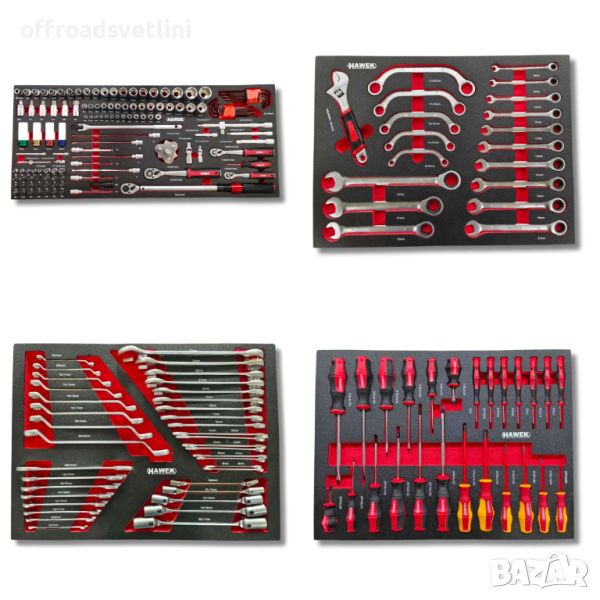 Количката за работилница Hawek е оборудвана с допълнителен набор от най-висококачествени инструменти, които ще отговорят на нуждите дори на най-взискателния потребител. Богатото оборудване на шкафа Hawek ще ви позволи да персонализирате набора от инструменти, за да отговорите на нуждите на най-взискателните предизвикателства в работилницата