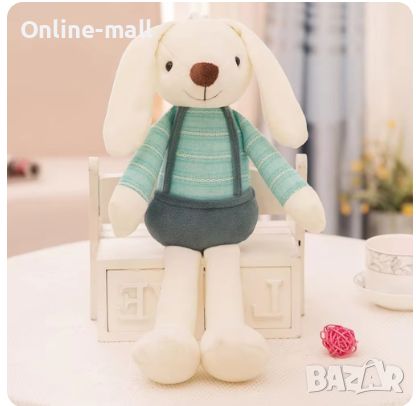 Играчките са много нежни и меки на допир. Зайчето е с дълги крака, раирана блузка, гащеризон и усмивка, която обезателно ще усмихне и вас!