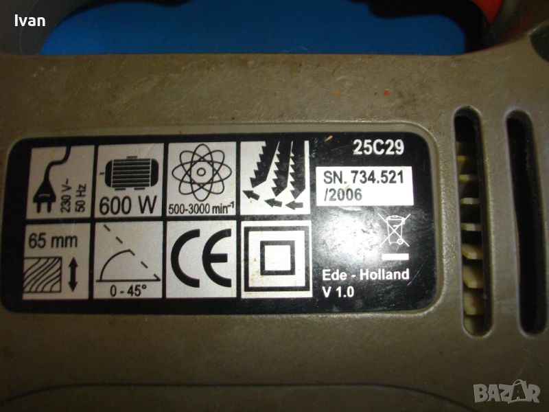 Описание на 600 ватов модел зеге Кинзо старо качество висококачествено произовдство, което в съвремието липсва, в син куфар. Цена - 99 лв. Вертикален прободен трион-зеге.Холандско професионално производство.Инструмента е като нов-много запазен външен вид и работи добре-машината е силна и мощна.Мощност на мотора-600 вата,обороти-от 500 до 3 000 в минута,регулируеми с 6 степени.3 положения наклон на ножа.Наклон на работният плот-от 0 до 45 градуса.Дълбочина на рязане при дърво-65 мм.Автостоп на спусъка-шпиндел.Дълъг конектор на отпадъчният прах за директно скачване в торба за прах или прахосмукачка.Прозрачен пластмасов предпазител на главата.Главата е за U образни ножчета-триони.Захвата е с 2 шестостенни болта.Наличие на оригиналният шестостенен ключ за плота и главата,във вградено място на кабела.Към инструмента има 1 брой оригинален на марката твърдосплавен нож-трион за дърво,с фабричното лого.Комплекта е прибран в оригиналният на марката твърд куфар с вложка.