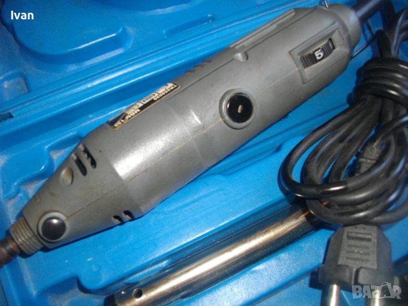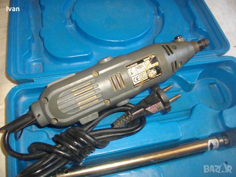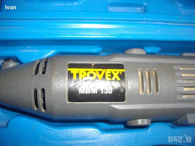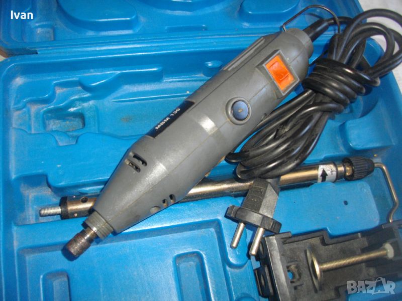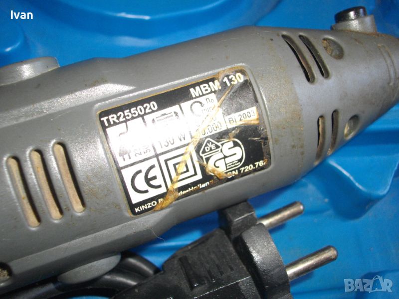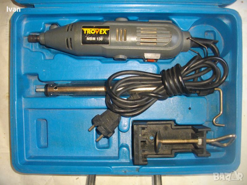 Цена на холандска професионална ел. мини дрелка - шлифовалка, производство на KINZO - марка TROVEX MBM 130 - ползвана - 130 вата - със стойка статив и телескопична тръба за окачване - в син куфар - 159 лв.