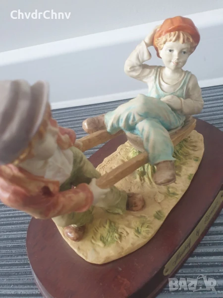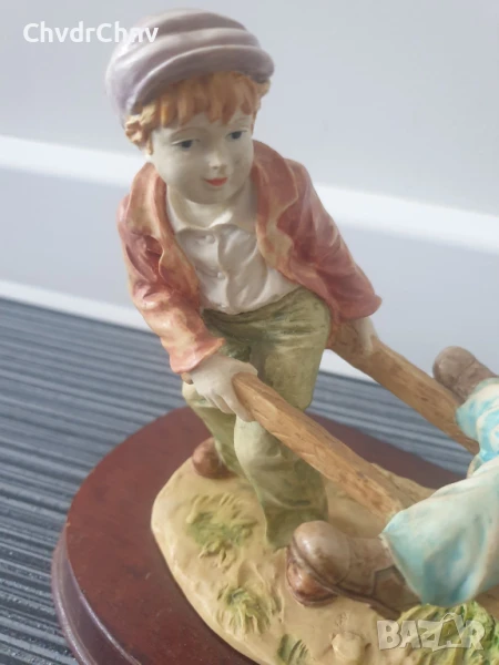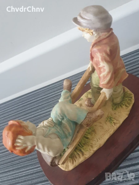 Височина 16 см, дължина 20 см, тежи около 1-2 кг, детайлна, ръчно оцветена, в приятни пастелени цветове, върху дървен постамент, без забележки.
