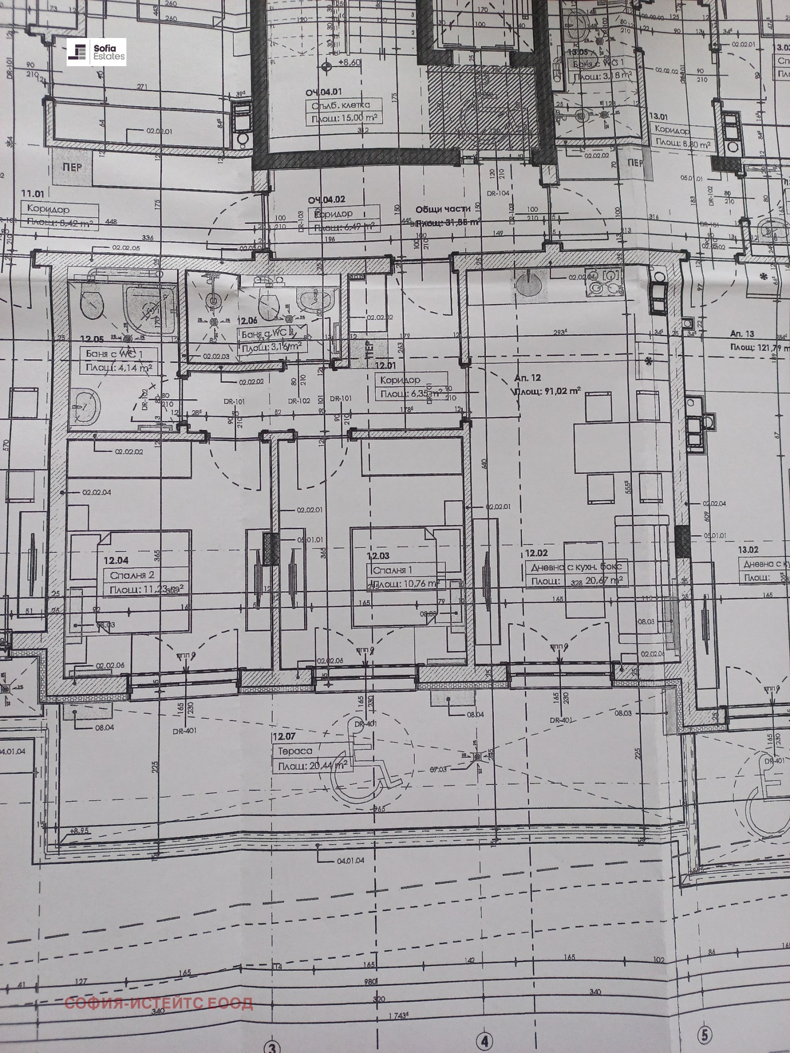 Апартамент 12 е разположен на четвърти етаж. Застроена площ 91,02 кв.м, с идеални части 109,37 кв.м. Разпределение: входно антре, дневна с кухненски бокс, две самостоятелни спални, две бани с тоалетни и тераса 20,44 кв.м с излаз от всички помешения. Изложение: изток.