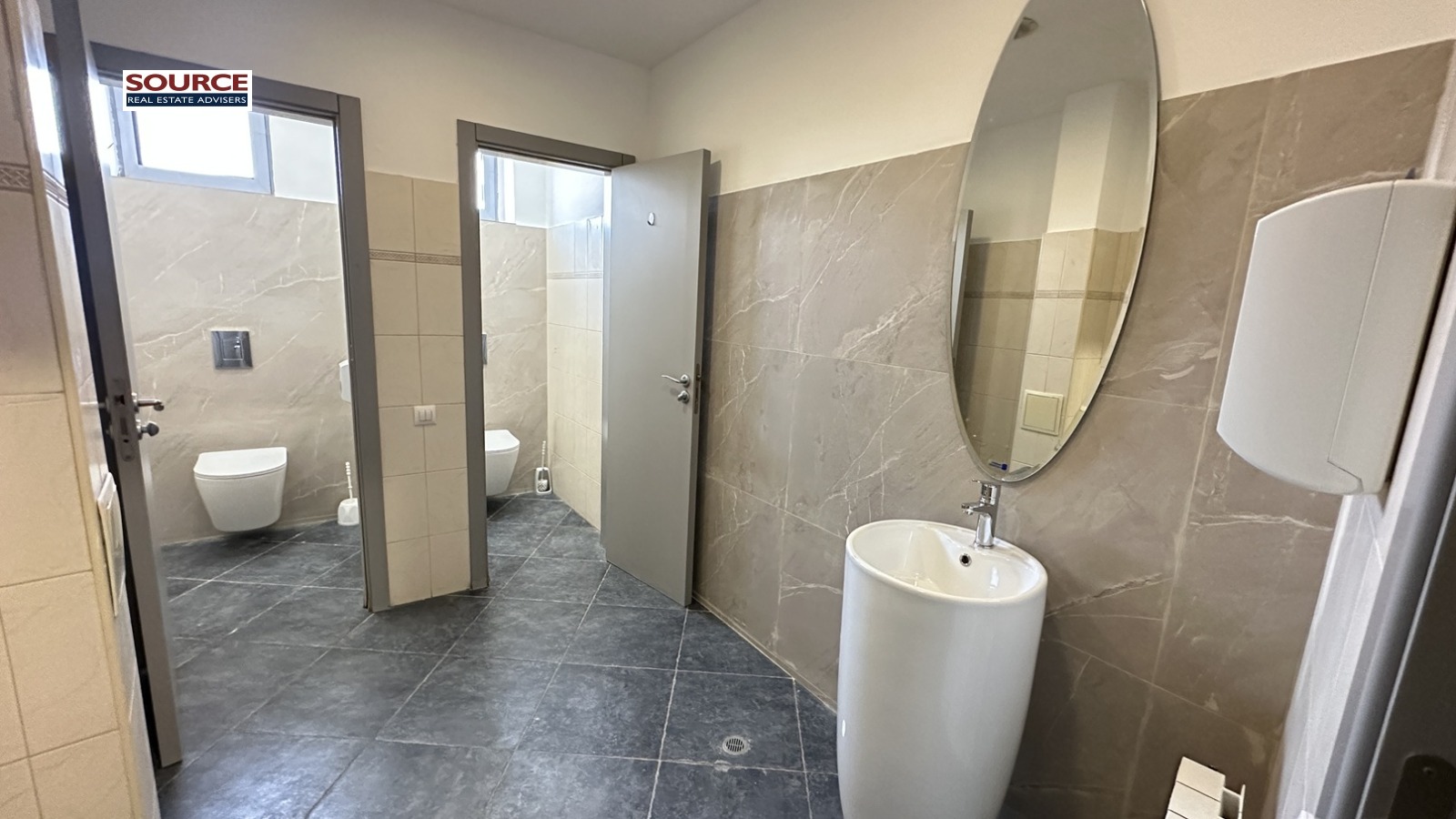 2. Разпределение: 1 голямо Open space помещение, 4 отделни работни помещения преградени със стъклени преградни стени, оборудвана кухня, рецепция, сървърно помещение, 5 wc с баня. Офисът може да бъде изцяло с Open space разпределение или допълнително преграден според изискванията на Наемателя.