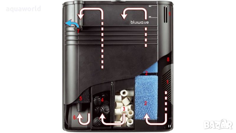Bluwave е вътрешен филтър, който съчетава три вида филтрация: механична, биологична и адсорбционна. На първия етап, благодарение на използването на гъби с различна порьозност, се извършва механична филтрация. След това чрез керамични пръстени с висока порьозност и голяма повърхност, както и на пластмасовите сфери Bluballs, имаме биологично филтриране. Гъбата с активен въглен е без мирис и осигурява адсорбционна филтрация, докато помпата Blupower, едновременно мощна и безшумна, предлага висока производителност и ниска консумация. Предлага се и допълнително отделение за нагревател Bluclima. Филтърът Bluwave е практичен и лесен за почистване в резултат на подвижните прегради. Идеален е за прясна и морска вода. Основните предимства на продукта са: