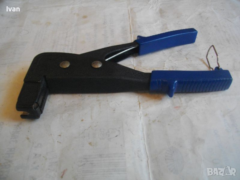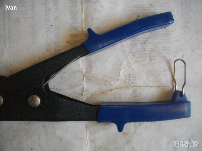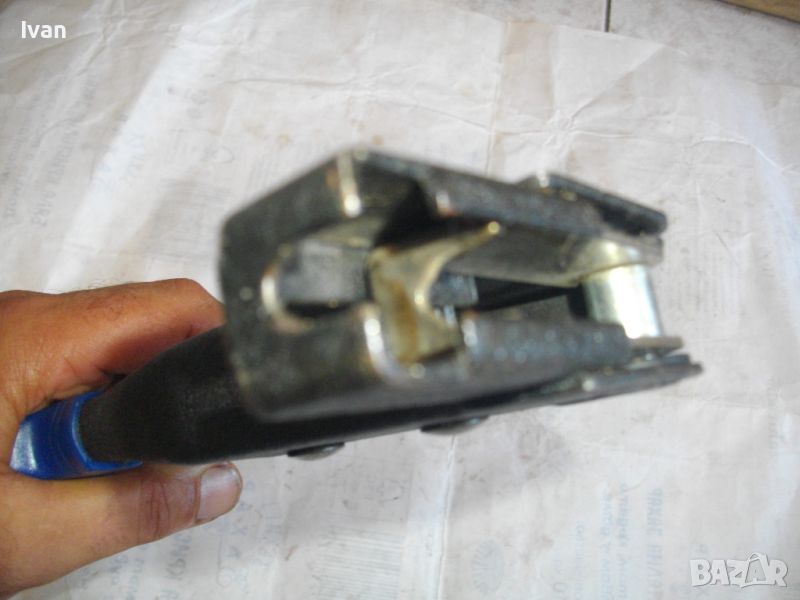 Сини дълги клещи. Цена 79 лв. Съвсем нови, неупотребявани. Немаркирани - липсва лого. Цялостна дължина - 240 мм, ширина /дължина на главата/ - 75 мм. Стоманена глава и корпусна част. Пластмасови масивни пкрития на дръжикет - релефни, нехлъзгащи се. Стегнат пружинен механизъм. Заклбючваща скоба на дръжките.