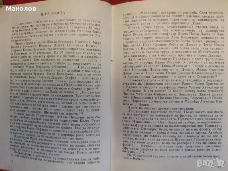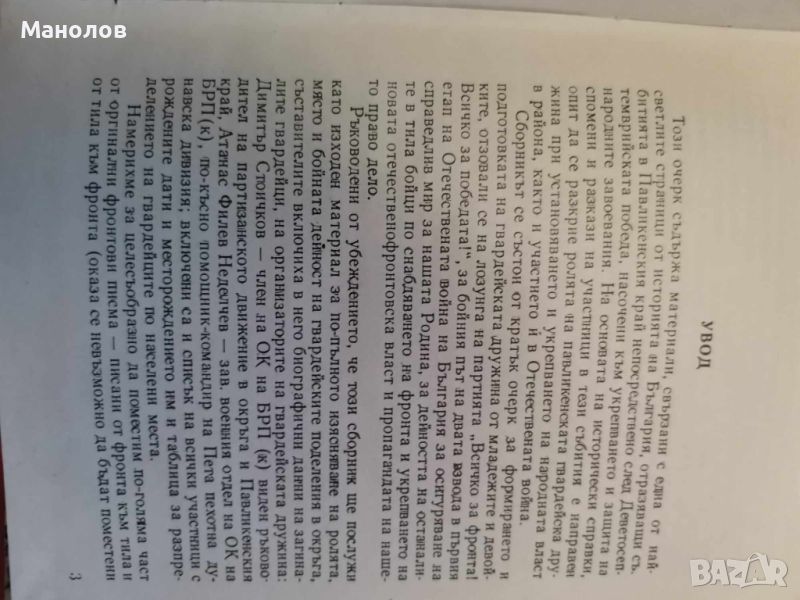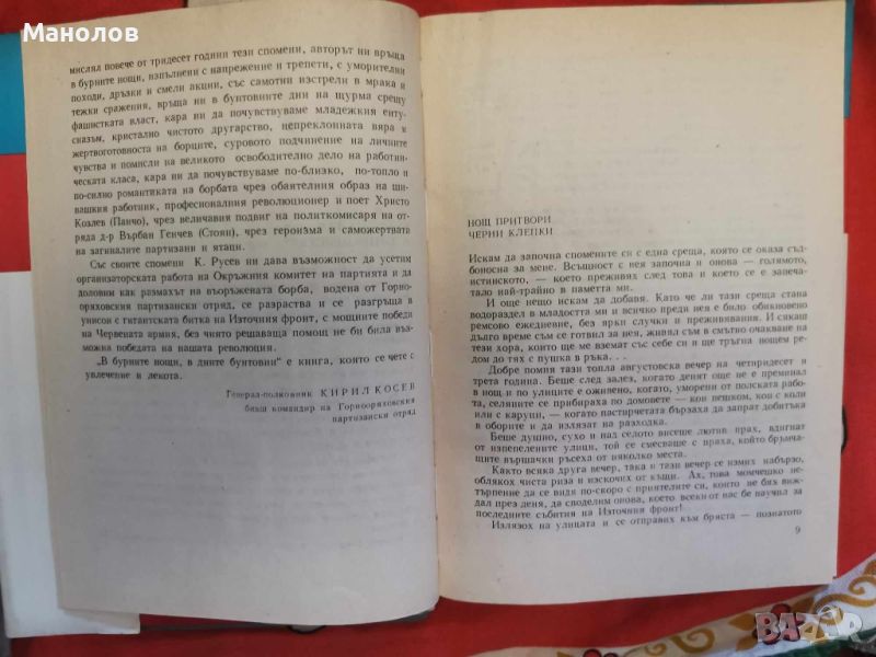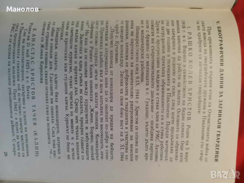 Книга: Напред, Другари Млади! Колю Русев--Неделка Кочева.-10 евро. Книга: В Бурните нощи В дните бунтовни,-2бр. Колю Русев-3 евро. Книгата Напред, Другари Млади сьдьржа Биографични Данни за следните лица загинали Гвардеици! 1.Рашко Колев Христов роден на 5 март 1918 в село Варана. 2. Атанас Христов Тачев {Калин} роден на 21май 1923г. в с. Батак. 3. Иван Михайлов Маслев роден на 20 април 1924г. в с. Сломер, живял в Павликени. 4. Любен Григоров Станчев роден на 19 март 1925г. в с. Михалци. 5. Христан Григоров Григоров роден на 6 януари 1924 в с. Недан. 6. Цвятко Ангелов Георгиев роден на 23 декември 1924 в с. Русаля. 7. Димитьр Стоименов Стойчков {Чолака} роден на 7 ноември 1912 в с. Лясковец. 8. Атанас Филев Неделчев {Начо} роден на 18 март 1911 в Бяла Черква. И много други! Книгата е много ценна за Близките и Роднините. Напред, Другари Млади! е единственият екземпляр който се продава в интернет пространството.