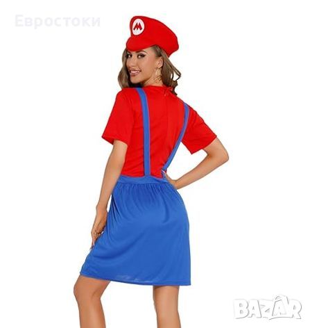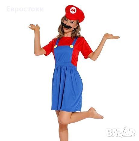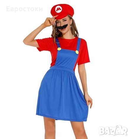 Дамски костюм на Super Mario включва червено-синя рокля с дизайна на известния гащеризон на Марио, червена шапка и сомзалепващи мустаци.