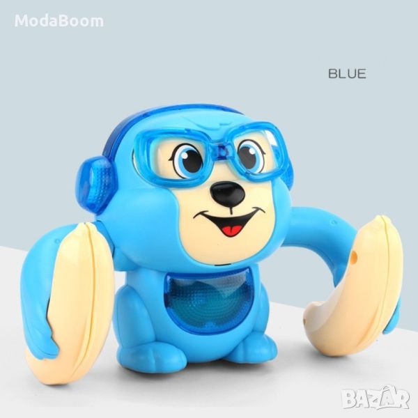 Бебешка играчка търкаляща се маймунка, дистанционно управление чрез пляскане. Материал: нетоксична пластмаса + ABS материали; Захранване: с 3 броя ААА батерии; Функция на работа: чрез пляскане с ръце; Бутон за включен/изключен; Размер на продукта: 10 x 14 см;
