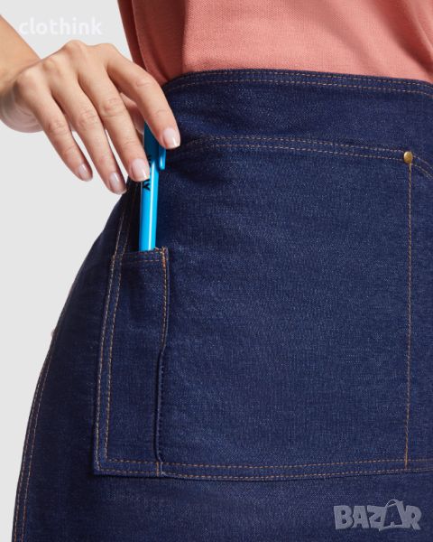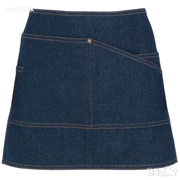 Къса унисекс дънкова престилка с контрастна връзка на талията. Престилката е с четири предни джоба, единият от които за химикалка.