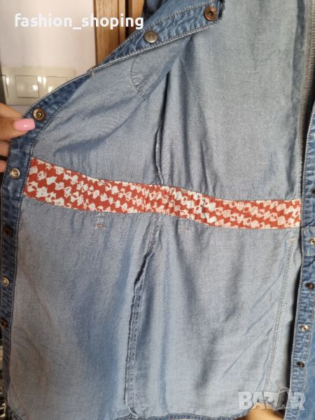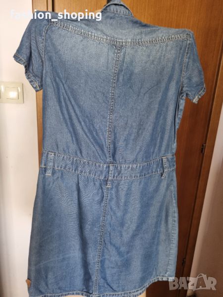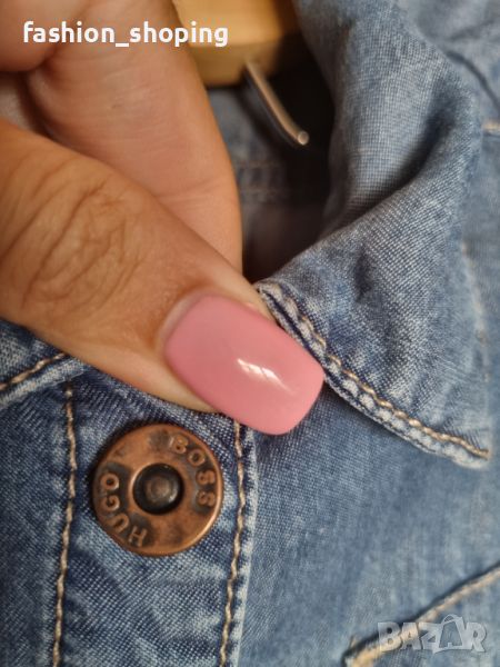 Рокля от деним за момичета на скъпия бранд Hugo Boss. Материята е много лека и тънка. Перфектна за топлите месеци. Закопчава се с копчета тик так, които са брандирани. С къс ръкав. С гайки за колан.