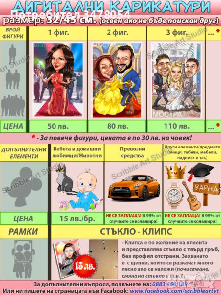 Предлагам професионално изработени дигитални карикатури и илюстрации на различни теми и поводи. Прекрасен и уникален подарък, оставящ спомен и емоции. Доверете ми се в изготвянето на рисунката, а аз ще ви отвърна с професионално отношение, подплътено с години опит в тази сфера! Качеството е гарантирано! Разгледайте галерията ми и ще се уверите в това. А ако желаете да поръчате, моля свържете се с мен на лично съобщение или по телефона. Благодаря Ви!