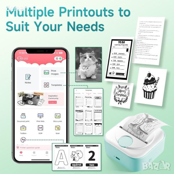 Пакетът мини принтер за етикети Q02 включва 1 зелен принтер Q02, 1 ролка от 53 мм бели етикети, кабел за данни и ръководство с инструкции. Компактен и лек с размери 87 x 90 x 40 mm и 200 g, той се побира лесно в джоб или чанта. Свързвайки се чрез Bluetooth, той работи безпроблемно с приложението Phomemo за лесно отпечатване на етикети по всяко време и навсякъде. Използвайки технологията за термичен печат, той елиминира необходимостта от мастила, тонери и ленти, намалявайки разходите за поддръжка и въздействието върху околната среда. Приложението Phomemo предлага множество шаблони за създаване на персонализирани етикети за снимки, бележки и списъци със задачи, лесно изрязани във всякаква форма и размер. Q02 е идеален, уникален подарък за деца, семейство, съученици, учители и ентусиасти „Направи си сам“ за специални поводи като Коледа, Ден на детето или Деня на благодарността.
