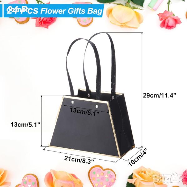 Този комплект от 24 торбички за подаръци с цветя е с размери 4 инча (10 см) ширина, 5,1 инча (13 см) височина на кутията, 11,4 инча (29 см) обща височина, 5,1 инча (13 см) в горната част и 8,3 инча (21 см) в долната дължина. Изработени от здрав картон, тези чанти са идеални за съхранение на цветя и различни подаръци, предлагайки едновременно издръжливост и стил. Проектирани в елегантна форма на ръчна чанта с двойна верижна дръжка за лесно носене, те позволяват на цветята да се разтягат и показват красиво. Идеални за сватби, Свети Валентин, рождени дни, годишнини, Деня на благодарността, Коледа, дипломи или проекти „Направи си сам“, тези торбички за подаръци с цветя добавят модерен и модерен щрих към всеки повод.