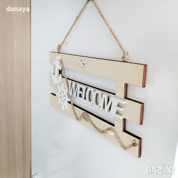 MDF табелка с надпис “Welcome” , декорирана с морски елементи котва, рул и малко рапанче. Тази красива табелка е изработена от висококачествен MDF материал, а морските елементи – котва, рул и рапанчето придават на декорацията изискан морски чар. Идеална е за входни врати, коридори или като акцент в дневната. Тази табелка ще донесе свежест и гостоприемство във вашия дом или офис. Направете всяко посрещане специално с тази морска табелка “Welcome”!