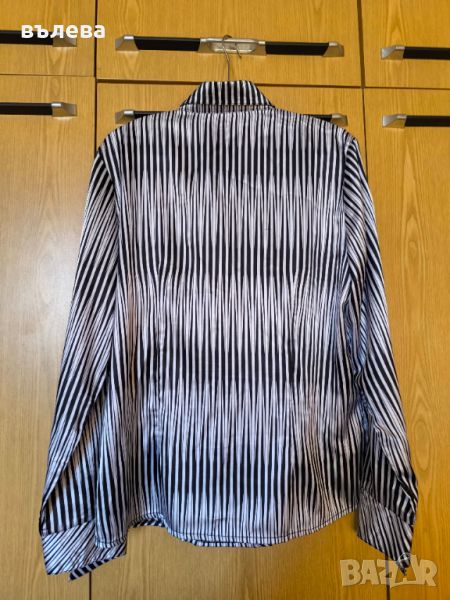 Сатенена риза, вталена,черно-бели, гръдна обиколка 104см, талия 94см, дължина 65см, дължина на ръкава 60см.