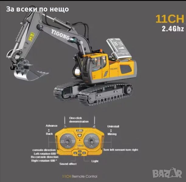 Интуитивно радиоуправление: Снабден с 11 канално радиоуправление на 2.4Ghz, този багер осигурява стабилна връзка и лесен контрол на всяко движение.