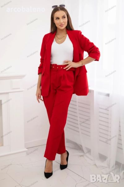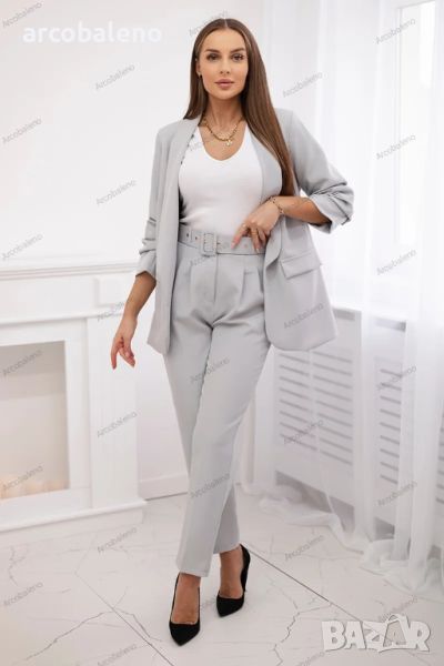 Представяме ви елегантен комплект сако и панталон. Сако без закопчаване с предни ревери. Якето е с подплата. Панталон с джобове и колан. В задната част на панталона има пришит ластик. Много модерен и стилен комплект. Комплектът е изработен от висококачествен материал. Размерът е универсален и ще бъде подходящ за дами с размер S, M или L.