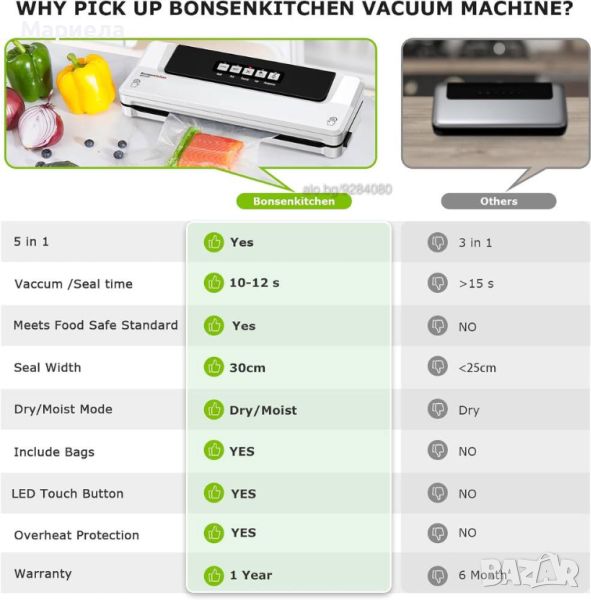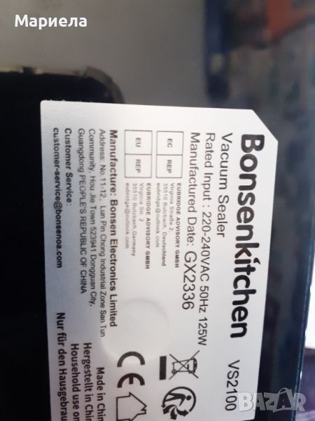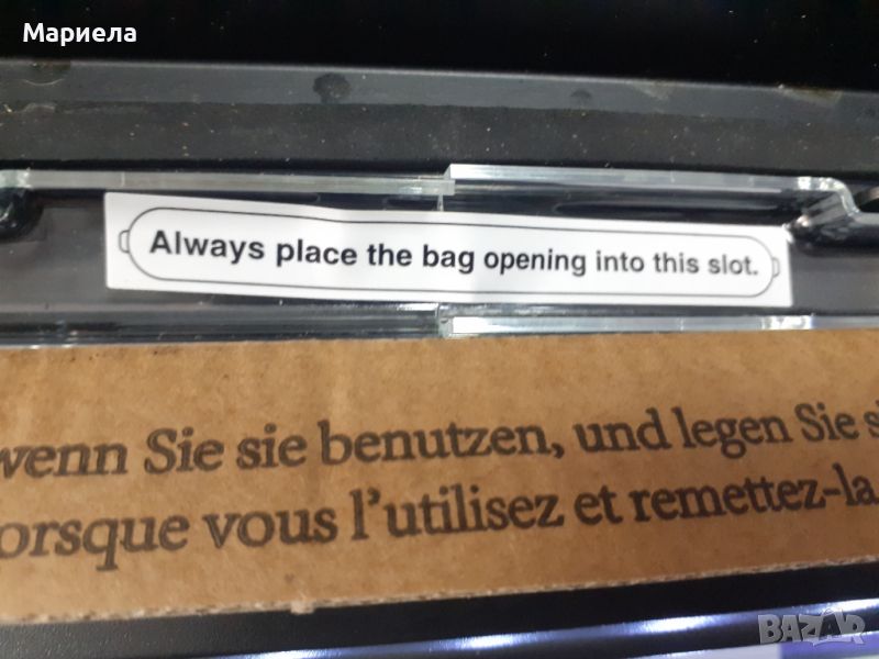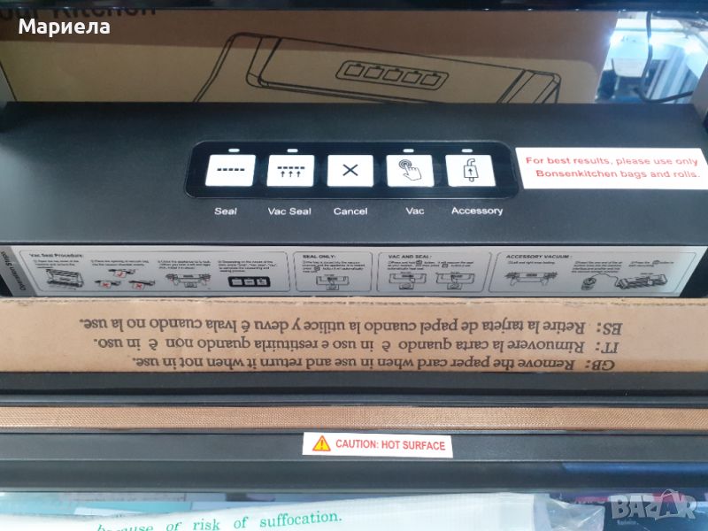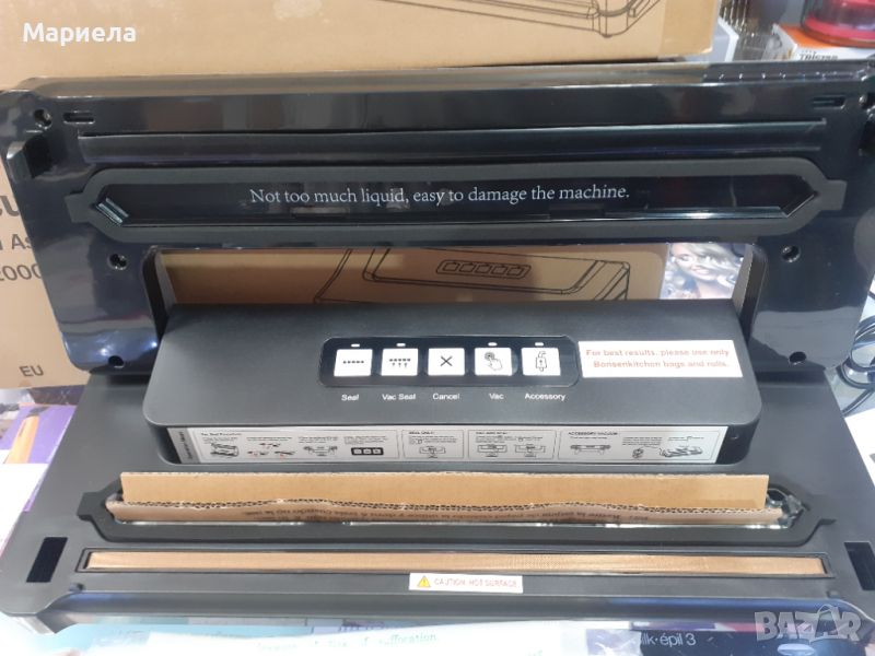 Уредът е нов с минимални забележки само по опаковката.Разполагам с 2 броя една бяла и една сива тествани отлично работещи.Към машината има няколко плика за старт.Работи с гофрирани пликове или фолио на ролка до 30см.